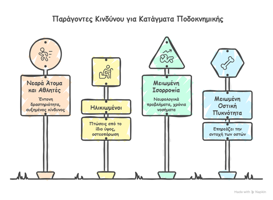 - Ηλικιωμένους, όπου ακόμη και μια πτώση από το ίδιο ύψος μπορεί να οδηγήσει σε κάταγμα, ιδιαίτερα όταν υπάρχει οστεοπόρωση ή γενικευμένη μυϊκή αδυναμία.