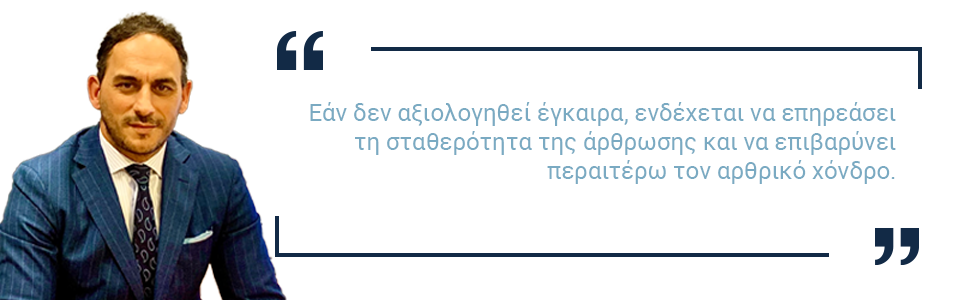 Η βλάβη μπορεί να προκύψει αιφνίδια μετά από συγκεκριμένο τραυματισμό ή να εξελιχθεί σταδιακά με την πάροδο του χρόνου. Εάν δεν αξιολογηθεί έγκαιρα, ενδέχεται να επηρεάσει τη σταθερότητα της άρθρωσης και να επιβαρύνει περαιτέρω τον αρθρικό χόνδρο.